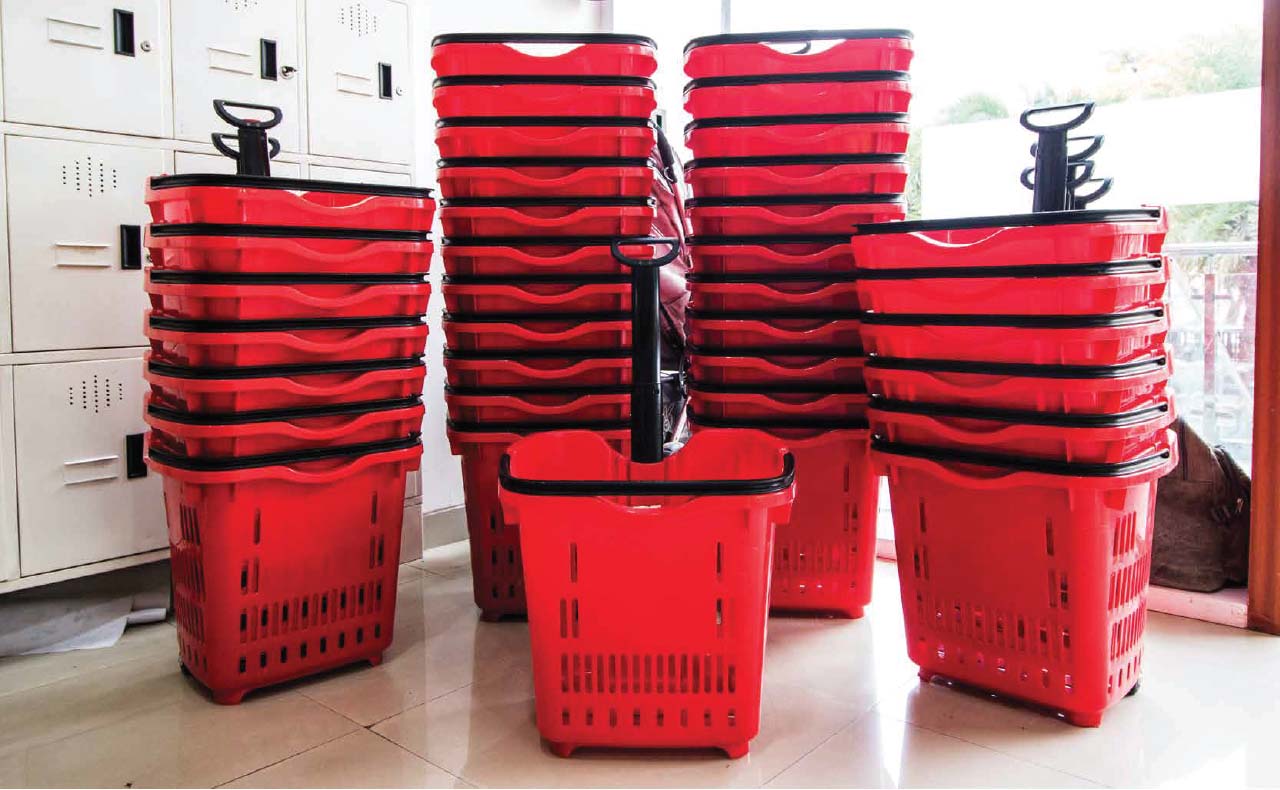 - Baskets with wheels for added convenience